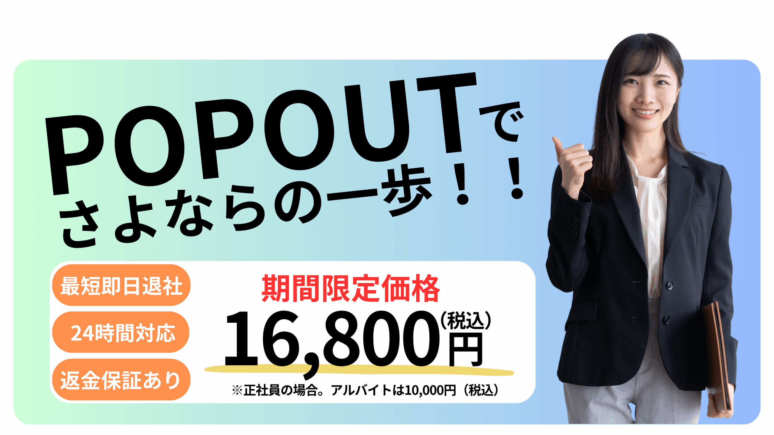 | 表 | POPOUT | 一般の会社 | 労働組合の退職代行 | 弁護士の退職代行 |