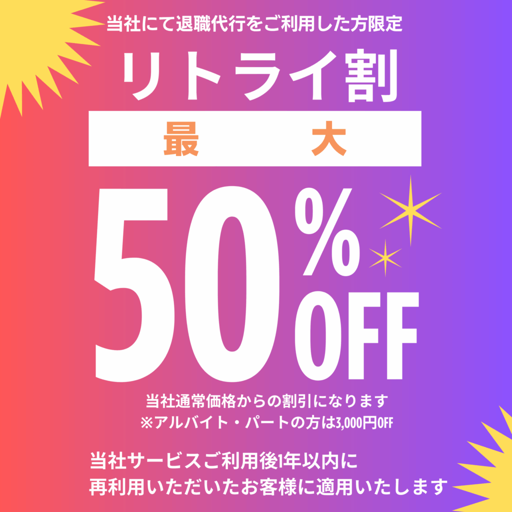 『再就職したけど、また職場環境に恵まれなかった…』なんてこともあるかもしれません。当社ご利用後1年間は、次回50%OFFでご利用いただけます。